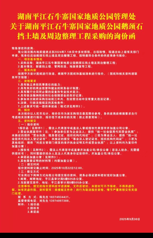 湖南平江石牛寨国家地质公园管理处关于湖南平江石牛寨国家地质公园鹅颈石挡土墙及周边整理工程采购的询价函