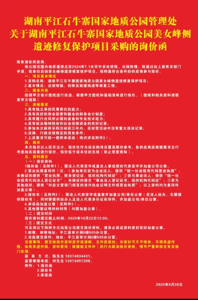 湖南平江石牛寨国家地质公园管理处关于湖南平江石牛寨国家地质公园美女峰侧遗迹修复保护项目采购的询价函